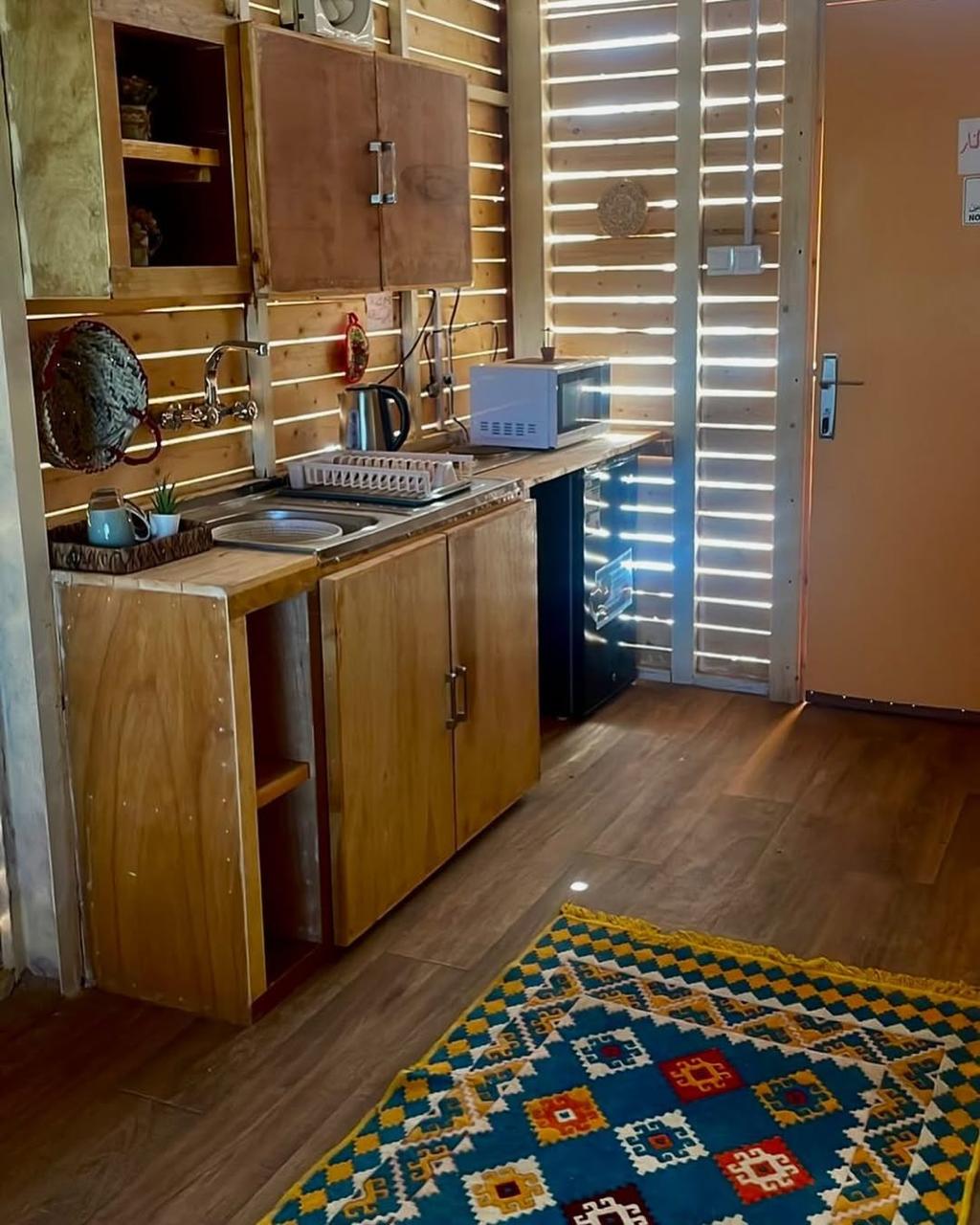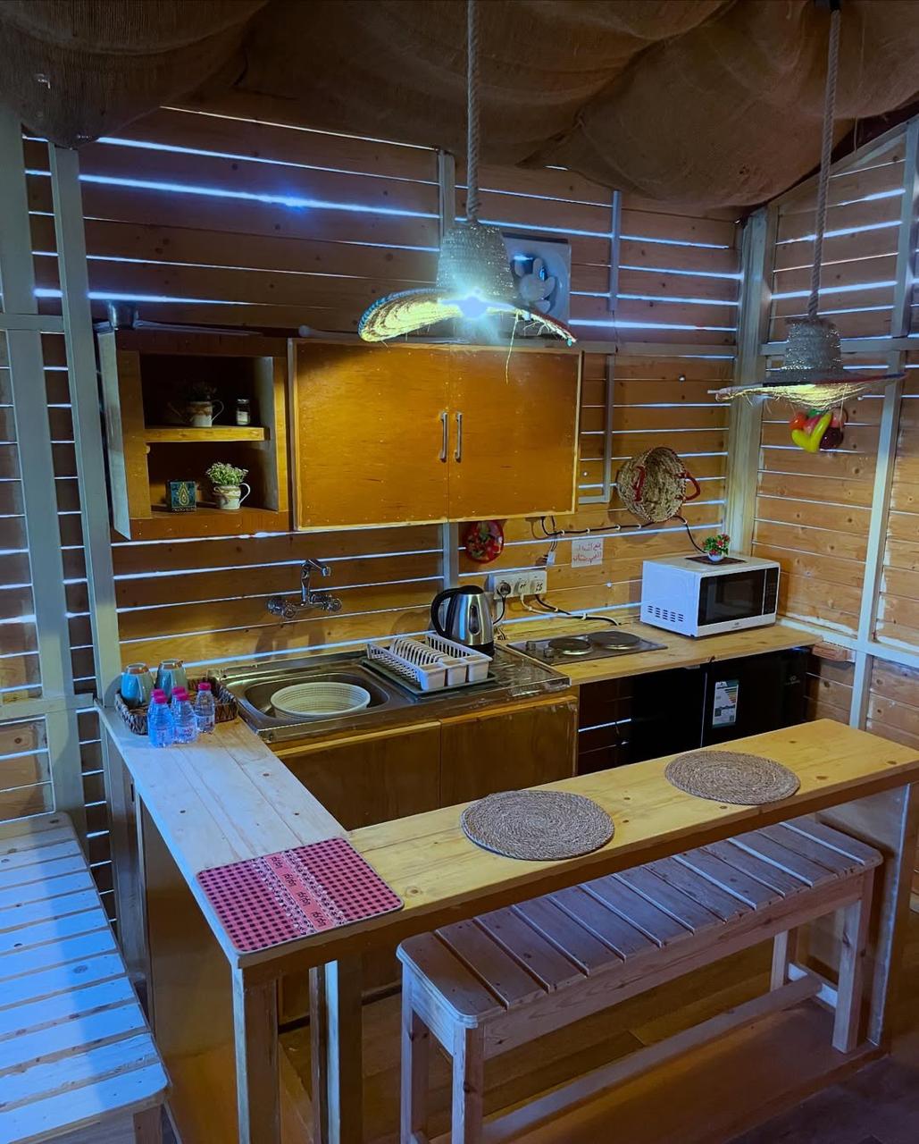 ومطبخ متكامل فيه مكرويف وقز كهربائي وغلايه وثلاجه وادوات الطبخ متكامله
