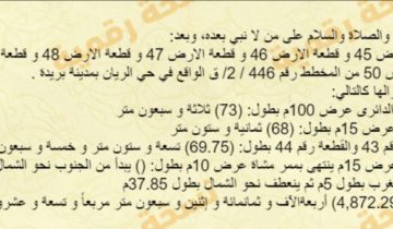 • شرقًا: قطعة رقم 44 بطول (69.75) تسعة وستون مترًا وخمسة وسبعون سنتيمترًا